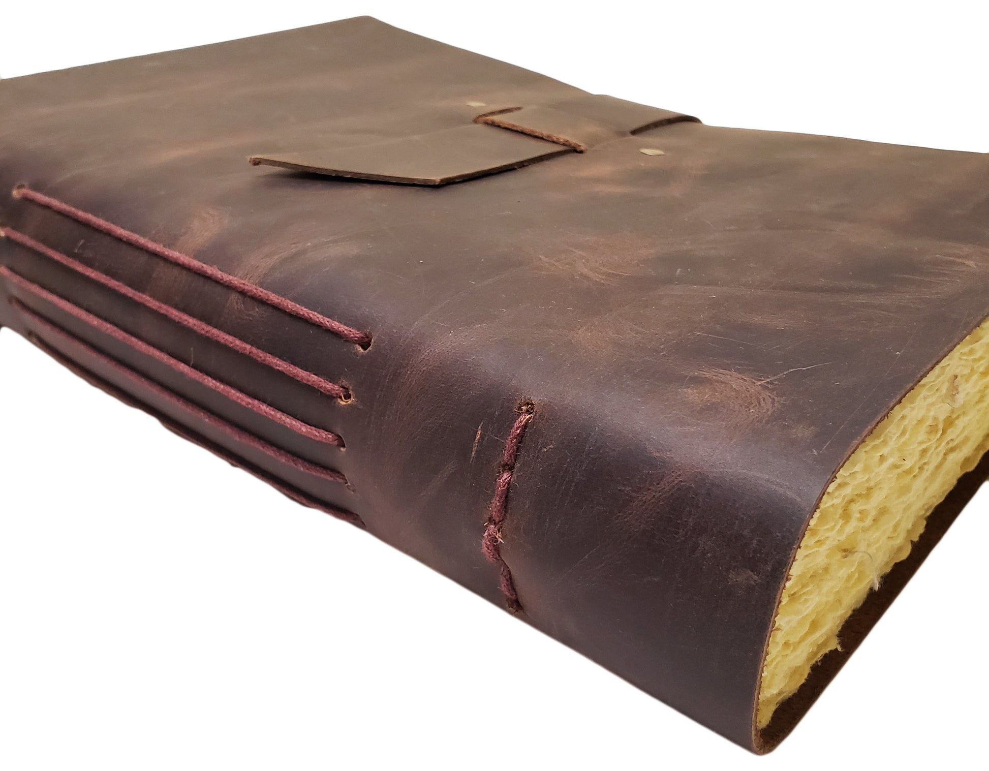 This extra large leather journal measures a foot long and 9 inches wide, and includes a whopping 320 cream colored pages (160 sheets) that are hand sewn into the leather binding. The acid-free, cotton pages are the perfect surface for writing or sketching with a pencil, ball point pen, or your favorite fountain pen.